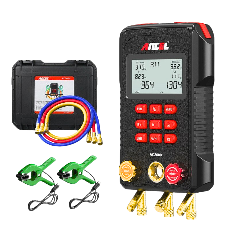 Ancel AC3000 — современный цифровой многофункциональный манометр, предназначенный для профессионального использования при обслуживании автомобильных кондиционеров и систем охлаждения. Устройство измеряет давление на высоких и низких сторонах, отображает температуру насыщения и испарения, а также позволяет проводить тесты утечек и вакуумные проверки.
