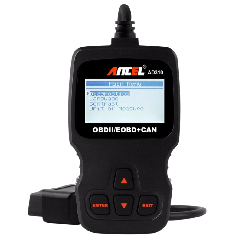 Ancel AD310 — компактный мультимарочный сканер для диагностики двигателя. Поддержка OBDII/EOBD+CAN, чтение и сброс ошибок, Live Data, Freeze Frame и проверка готовности I/M.
