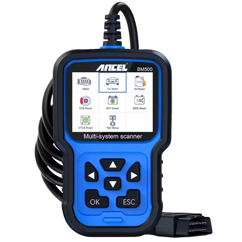 Ancel BM500 — диагностический сканер для BMW и Mini. Поддерживает чтение и удаление ошибок, адаптацию модулей, более 20 сервисных функций, сброс сервисных интервалов и кодирование.