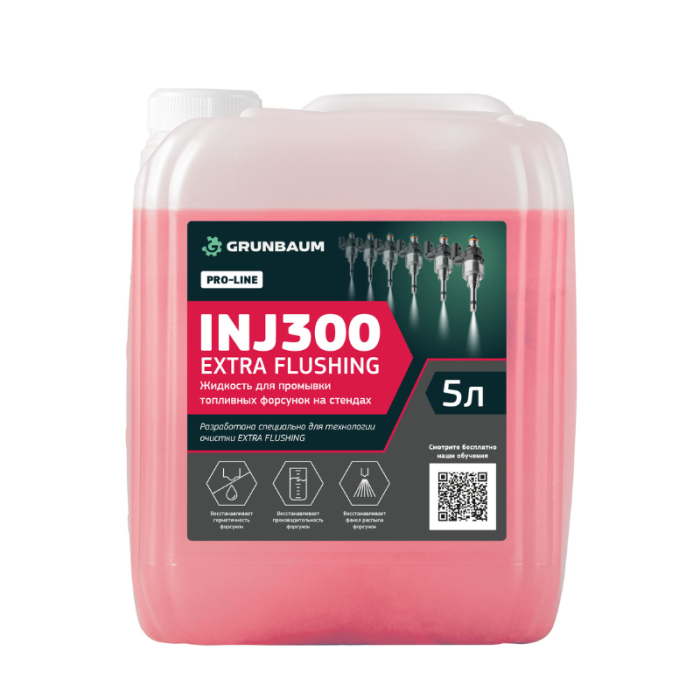 Grunbaum INJ300 EXTRA FLUSHING — это специализированная жидкость для промывки бензиновых форсунок всех типов (MPI, SPI, GDI, FSI). Она применяется на профессиональных стендах GRUNBAUM INJ6000N GDI и разработана специально для работы по технологии EXTRA FLUSHING.