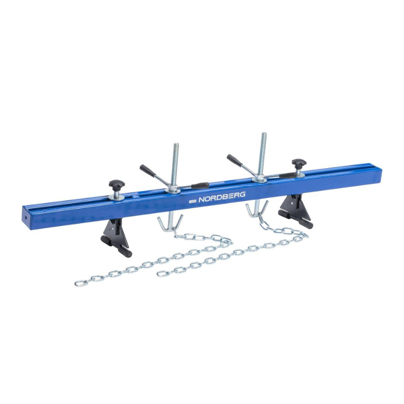 NORDBERG N3005 оснащён балкой длиной 150 см, что позволяет использовать его даже на автомобилях с широким моторным отсеком. Регулируемые опорные лапы обеспечивают надёжное упирание в кузов и равномерное распределение нагрузки, исключая деформацию поверхностей. Для дополнительной безопасности применяются прочные цепи с фиксатором, которые удерживают двигатель в нужном положении и предотвращают смещение во время ремонта.