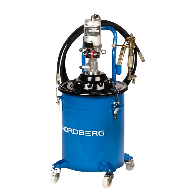 Установка работает от сжатого воздуха, создавая стабильное давление 6–8 бар. Благодаря этому подача материала остаётся равномерной, а расход — экономичным. В комплект входит гибкий шланг с пистолетом, который позволяет легко обслуживать даже труднодоступные механизмы. NORDBERG NO5020 ускоряет процесс обслуживания и снижает вероятность ошибок при смазке узлов.
