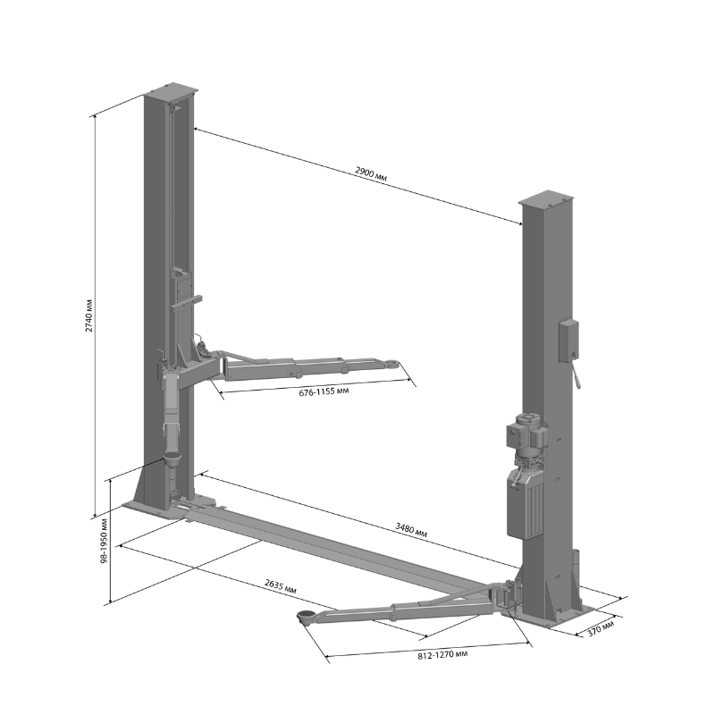 Минимальная высота подхвата — всего 98 мм. Поэтому подъемник удобен для машин с низким клиренсом. Максимальная высота подъема составляет 1950 мм. В результате мастер работает в комфортных условиях при любом ремонте. Кроме того, увеличенное расстояние между колоннами — 2900 мм. Благодаря этому легко обслуживать широкие автомобили.