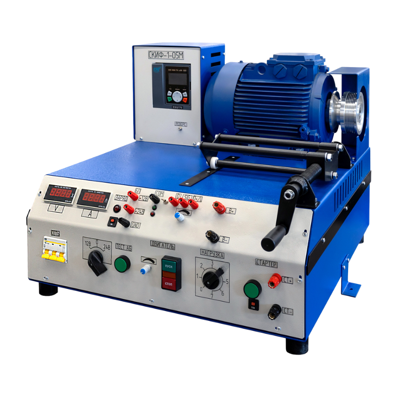 Стенд СКИФ-1-05М предназначен для проверки технического состояния снятых с автомобилей генераторов с номинальным напряжением 14В и 28В под нагрузкой, а также стартеров в режиме холостого хода. Стенд имитирует работу бортовой сети автомобиля и включает АКБ 12/24В, регулируемую нагрузку, измерительные приборы, усиленный электрический привод с частотным преобразователем и силовой источник питания для стартеров.