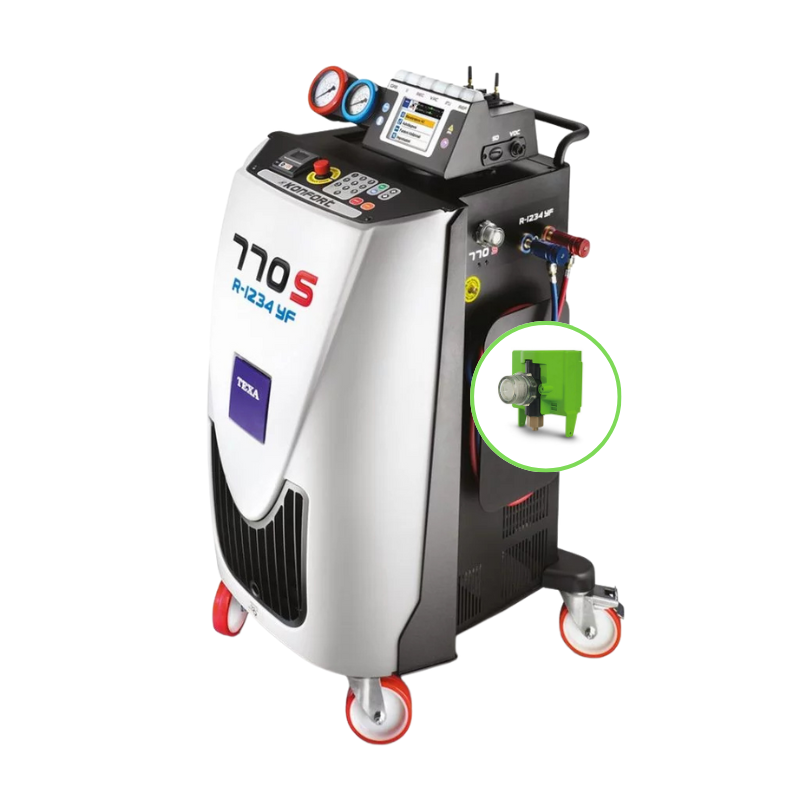 TEXA Konfort 770S TOUCH RID спроектирована специально для работы с R1234yf. Модель ориентирована на официальные и продвинутые сервисы: манометры WIKA класса 1, двухступенчатый вакуумный насос 100 л/мин, герметичный компрессор 12 см³, поворотный кронштейн, сертифицированные быстросъёмы для R1234yf с предвыкачкой. Встроенный RID-идентификатор хладагента на базе NDIR-технологии определяет тип и чистоту газа до заправки, исключая ошибки и загрязнение.