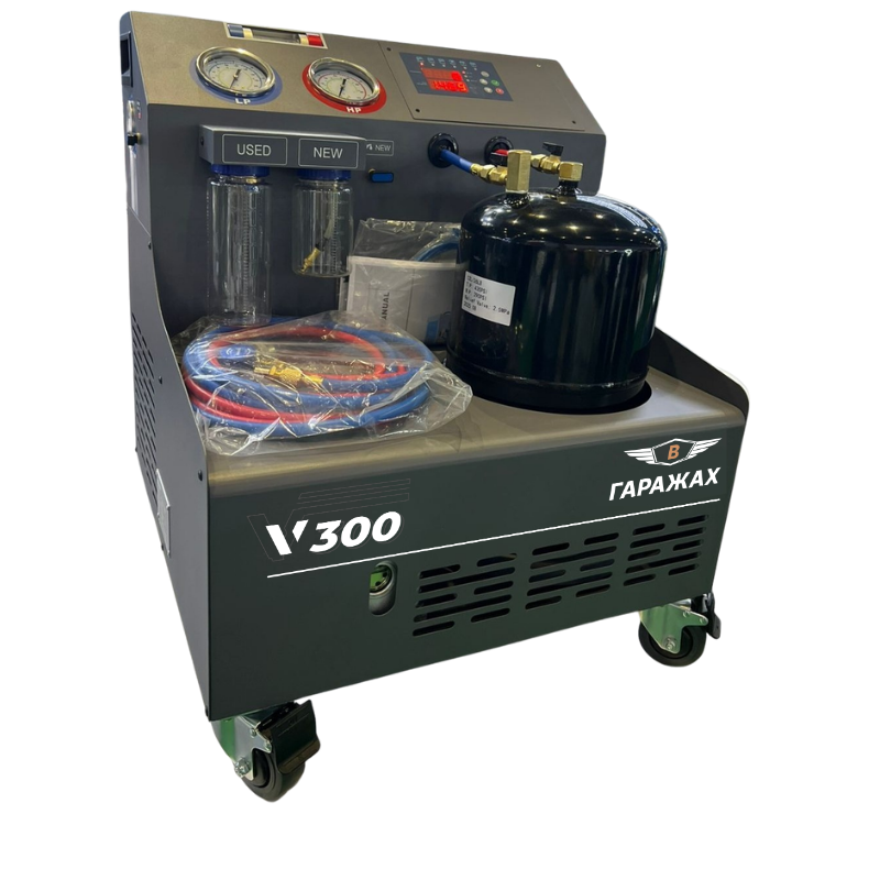 Вгаражах V300 — практичное решение для выездного обслуживания автокондиционеров, позволяющее расширить услуги автосервиса без покупки крупной автоматической станции.